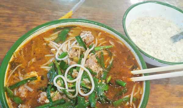 昆明人喜歡的小鍋米線是酸辣口,湯底基本都會放酸菜,再加上豆芽、韭菜和滿滿的肉末,用的米線是粗醬米線,非常入味,滑溜溜地入口即斷,應該是沒有加膠質的。他們的湯底味道很濃郁,有點像老壇酸菜的味道,肉沫很大坨像在吃獅子頭,從買單到端粉全程自助,沒有什麼服務,有一種接地氣的感覺。