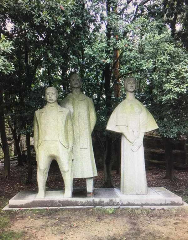 我俩在王阳明的雕像前观赏了一会儿,王阳明是明朝著名的哲学家,思想家,政治家和军事家。还有明末清初的著名画家陈洪绶。在树丛中立着三位民主革命者,他们是:秋瑾、陶成章、徐锡麟。又有四位科学巨匠出现在眼前,他们是:著名物理学家钱三强,我国能源工业创始人和奠基人孙越崎,中国函数奠基人,著名数学家陈建功,著名气象家,地理学家竺可桢。