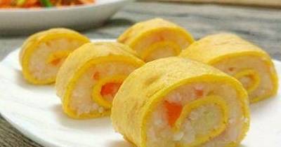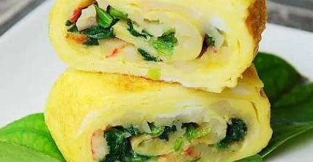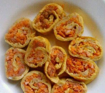 4:煎好的蛋皮盛出,用勺子一点点把土豆蔬菜泥抹平整。卷起压实。