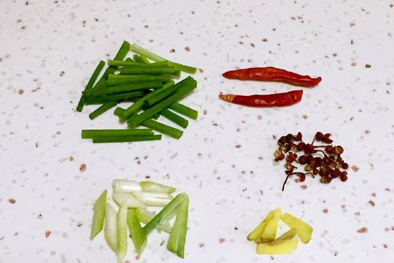 2、准备好葱姜花椒和干辣椒。花椒在这儿不能省,提香又提味儿,不吃辣的朋友可以把辣椒省了。