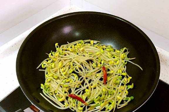 黄豆芽400克、干红辣椒2个、葱姜适量、花椒1小撮、生抽1汤匙、油盐适量。