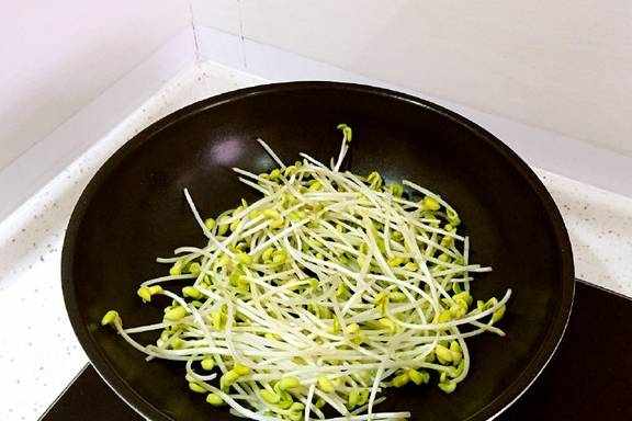 3、锅烧热,把黄豆芽放进去干炒,记住这里不放油,是干炒哦!小火把黄豆芽里的水分煸炒出来一些,这样做出来的豆芽又脆又有韧劲儿,口感非常好。