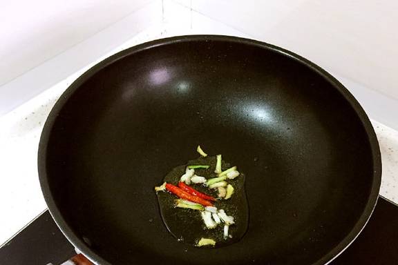 5、热锅凉油,先下花椒粒,小火炸出香味儿,然后捞出来不要。再放葱姜和干辣椒,继续炒出香味儿。