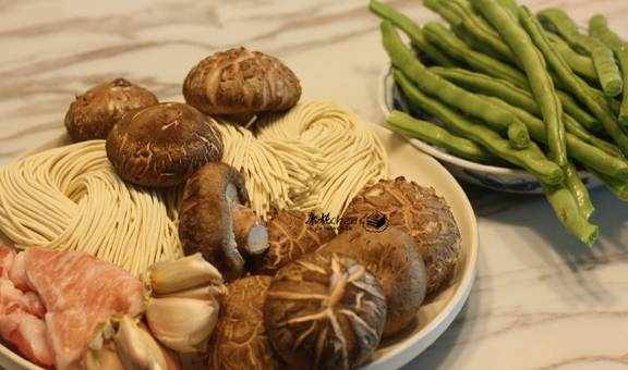 鲜面条300克,猪肉100克,鲜香菇300克,四季豆500克