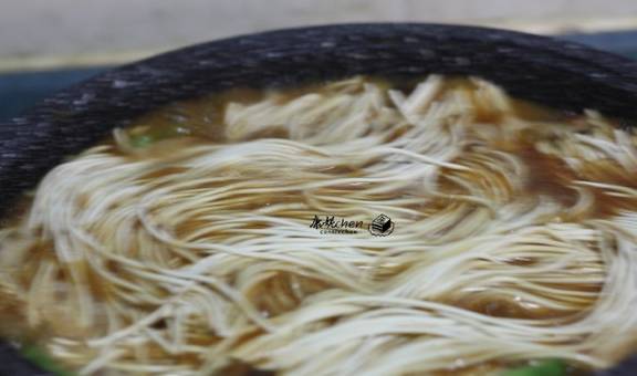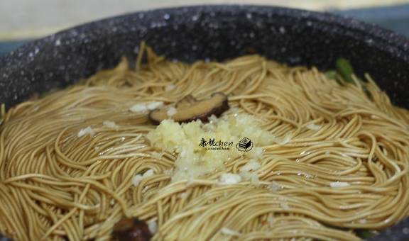 9当面条的汤汁所剩无几时,打开盖子,放入蒜蓉和芝麻油,拌匀
