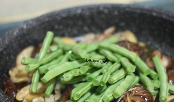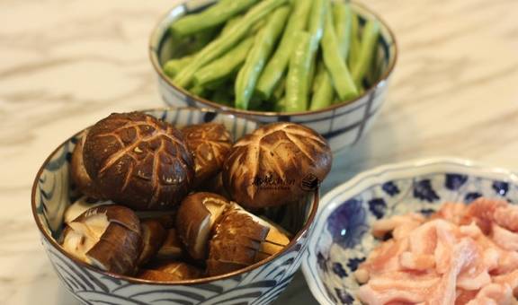 2猪肉切薄片,一部分香菇切片,香菇有几个没有切片,四季豆去头去丝,掰成小段