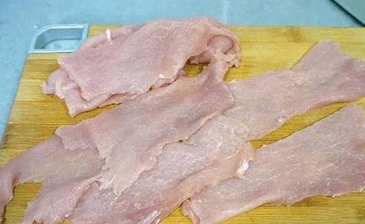 先将里脊肉切成片,用刀背拍打成成肉片,放入料酒和盐腌制入味;然后将水和淀粉混和成粘稠的糊状,随后将处理好的肉片和淀粉糊充分挂浆。