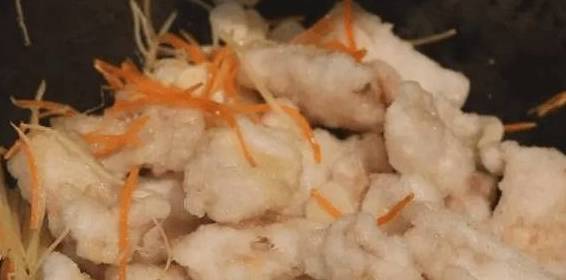 首先将切好的胡萝卜丝和葱姜丝爆香放入另一锅内爆香,再一次放入用糖、醋、盐、料酒调好的汁,最后放入炸里脊。迅速翻炒至里脊完全呈现金黄色即可。