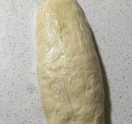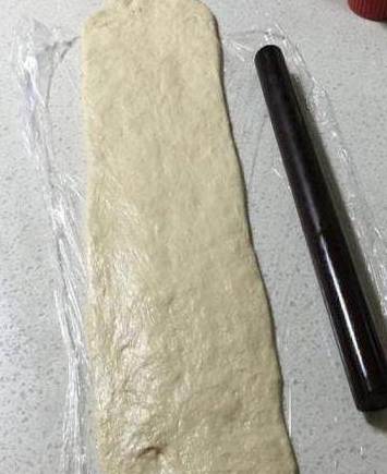 将其从冰箱拿出来回温10分钟!不用再揉了,擀面杖涂点油防粘,直接将面团擀成长方形,厚度和长度,我都没有量,就一个大概