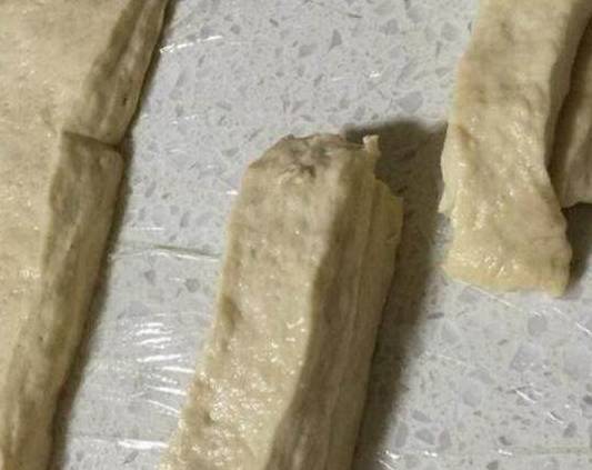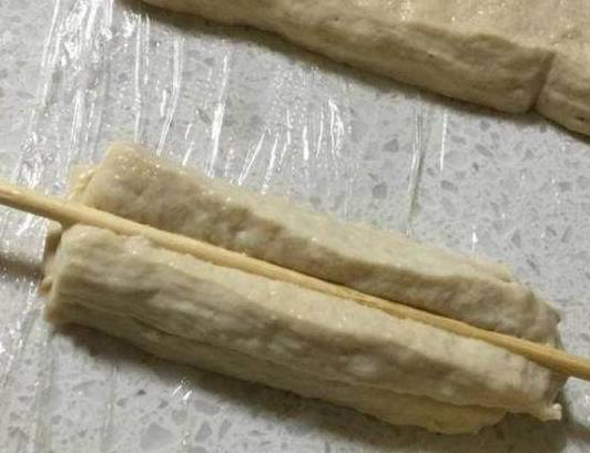 面包是比较虐的,水分大!尽量搓成长条!取一个保鲜袋,将袋都打开,放点玉米油涂均匀,以免粘,将油条包好,放入冰箱冷藏8小时!