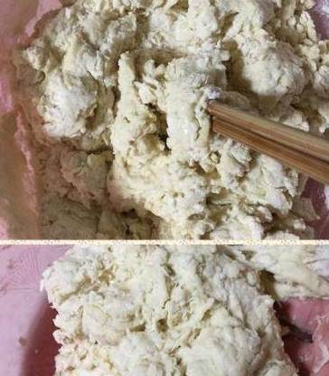 第二步:将高筋面粉,盐,小苏打,泡打粉,称好,放入盆里,用手搅拌混合!将搅拌好的蛋液水,慢慢倒入粉中,用筷子搅成碎状,接着用手揉成团
