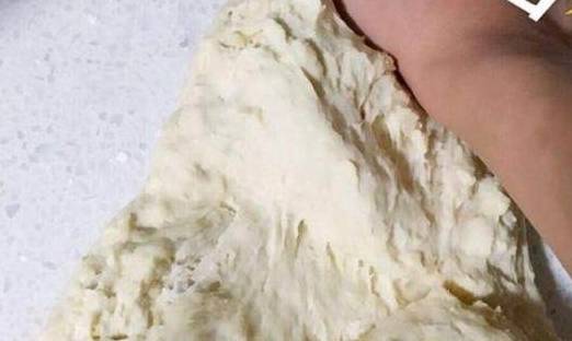 然后移放到操作台上!此刻的面团,会有点粘手,可以适量加点干粉,但不建议加多,不然会影响油条的蓬松度!像搓衣服一样,把筋搓出来