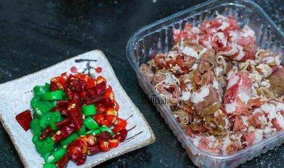 食材:肥牛片,干红椒,青椒,小米椒,淀粉,料酒,生姜,生抽,食盐,食用油。