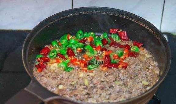 4、把牛肉铲到锅的一边,放青椒,小米椒,干红椒一起快速翻炒几个来回,煸炒出香味后和牛肉一起混合。