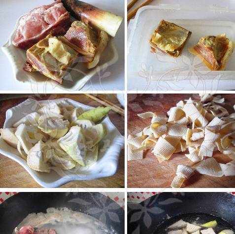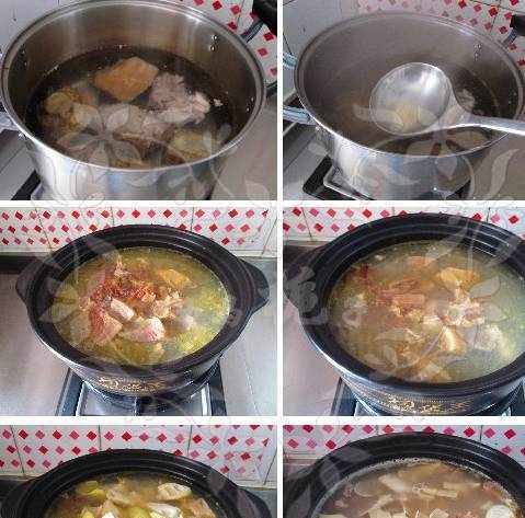 7汤锅注入水,加入火腿猪骨肉姜片烧开,