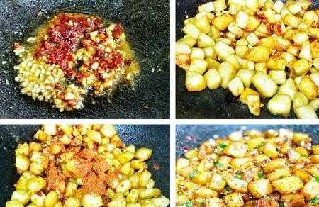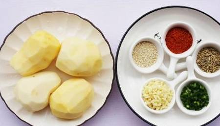 食材:土豆4个、香葱1根、大蒜2瓣、辣椒粉1勺、孜然粉1勺、白芝麻1勺、盐适量
