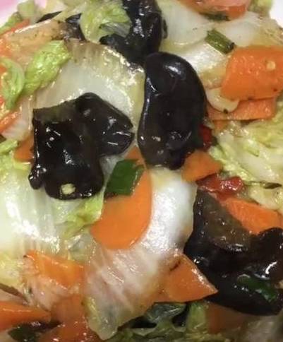 1:这个菜都需要白菜、胡萝卜、黑木耳、葱、姜、蒜、干辣椒、蚝油、盐、香醋、生抽、淀粉!