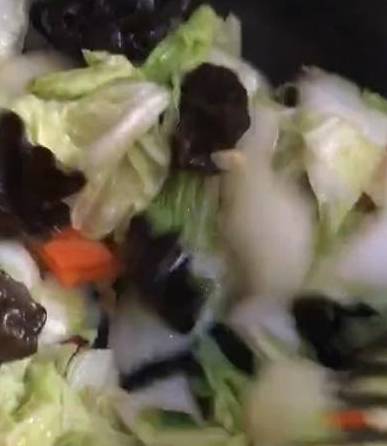 5.然后先把白菜倒入锅中,再下黑木耳、胡萝卜片!再将之前准备好的汤汁倒入锅中翻炒!