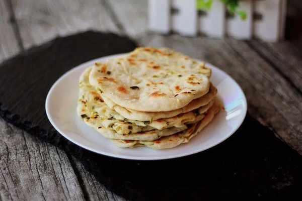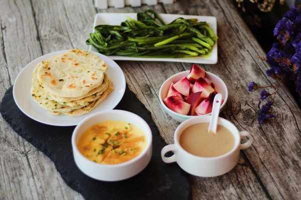 早餐:葱油饼、蒸蛋羹、红枣小米麦片糊、水煮油麦菜 、水果。