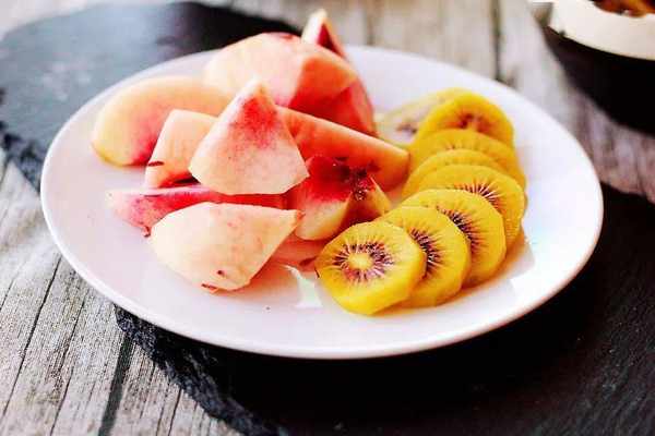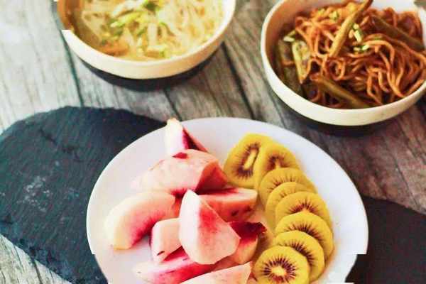 豆角焖面、丝瓜黄花菜金针菇肉丝汤、桃、猕猴桃。