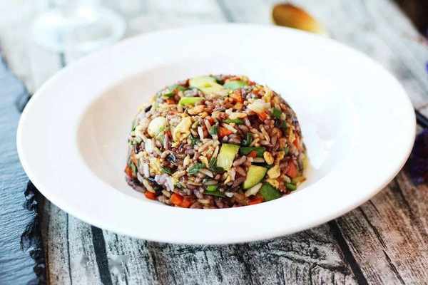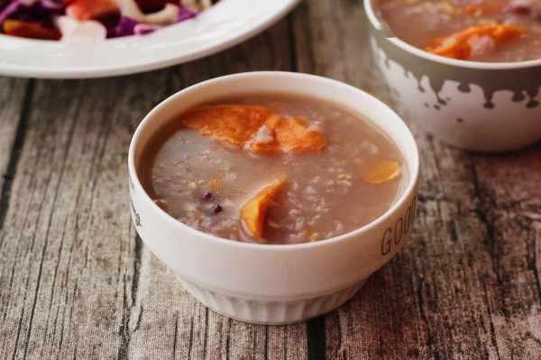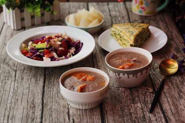 韭菜芝麻鸡蛋饼、拌虾仁紫甘蓝黄瓜白玉菇、红薯杂粮粥、梨。