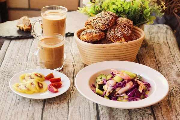 今日早餐:芝麻烧饼、北极虾拌紫甘蓝黄瓜、红枣枸杞核桃黑豆浆(黑豆提前浸泡一晚,沥干水后和核桃仁、红枣仁、枸杞、适量清水一起放破壁机中启用豆浆功能制作完成)、猕猴桃、圣女果。