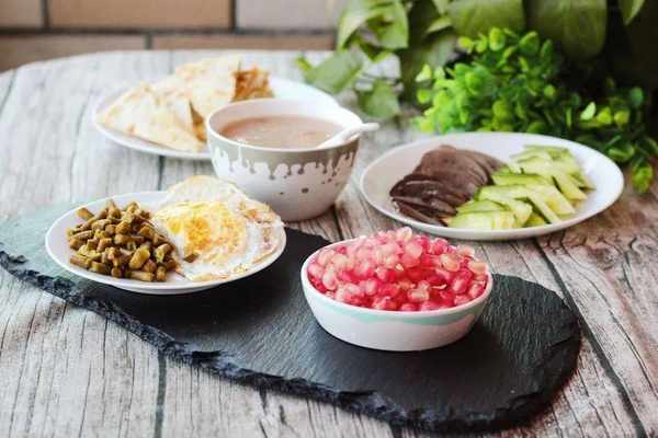 椒盐烫面饼、杂粮粥、水煮猪肝、黄瓜、煎鸡蛋、酸豇豆、石榴。