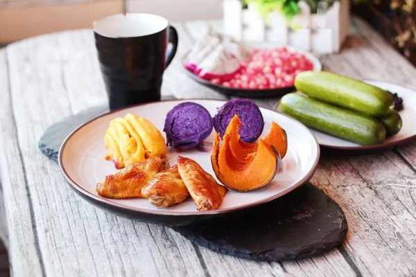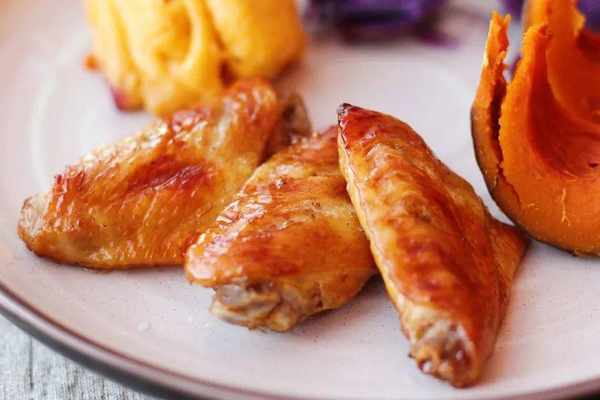 蒸南瓜、蒸紫薯、烤鸡翅、蒸南瓜花卷、乳黄瓜、火龙果、石榴、牛奶。南瓜花卷提前做出来放到冰箱里的。鸡翅提前加盐、酱油、生抽、蜂蜜、柠檬混合拌匀腌制一晚,早上放烤箱中200度烤30分钟,中途翻面。