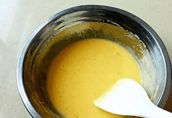 2、倒入适量温水于打蛋盆中,同时加入60克左右的低筋面粉,用勺子均匀搅拌至均匀成蛋糊。再将蛋糊放入模具中,如果家里没有模具也可用杯子、碗等代替。