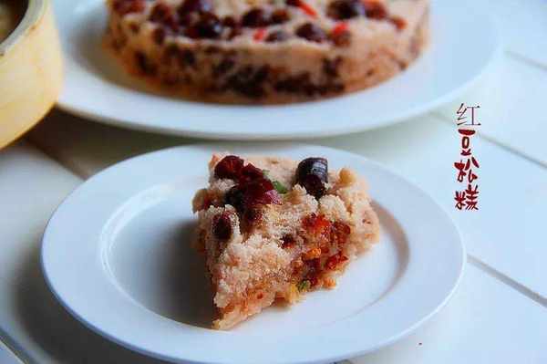 大米粉120g,糯米粉90g,糖50g,红豆150g,清水400g,大枣4个, 蜜豆50g,青红丝少许