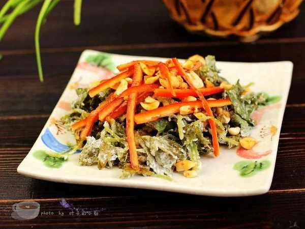 5、蒸好的菜上码放上红椒丝、花生碎,淋上调味汁即可。