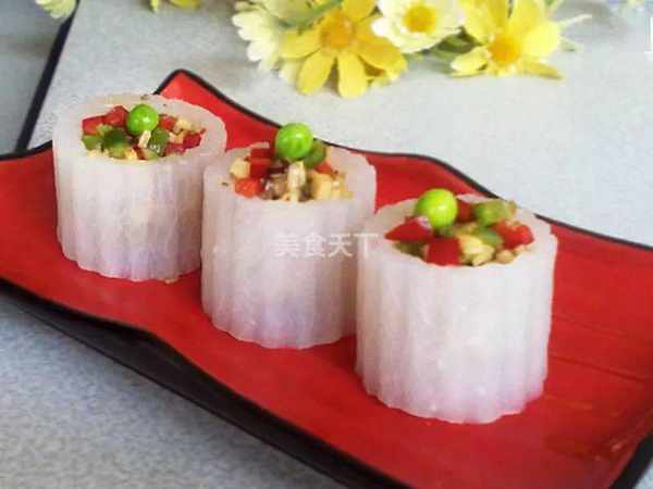 10、把炒好的材料放入萝卜盅内,点缀熟豌豆。ok!