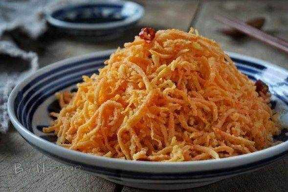 1、胡萝卜用刨菜器刨成细丝,泡在盐水里10分钟左右