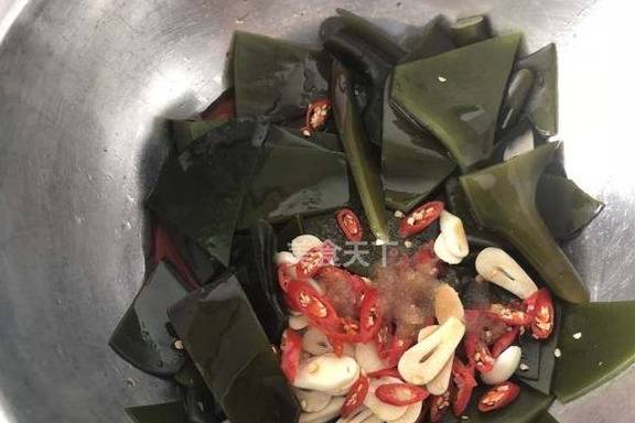 3.将海带根、大蒜、肽椒放入容器中,加入糖、醋和味精。
