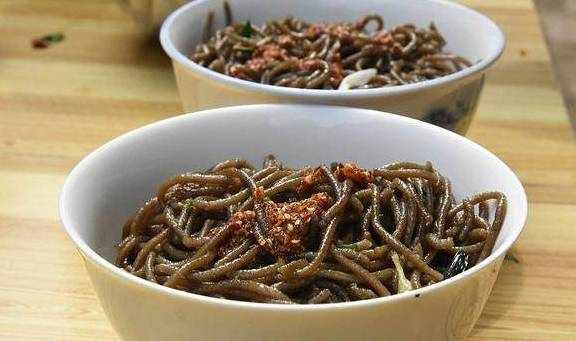 压出的红薯饸饹面颜色是黑的,看起来就如钢丝一般,所以也被人们戏称为“钢丝面”,这种面压出来就是熟的,可以凉调吃,也可以拌上山区独有的“小蒜”,下锅再炒一下。