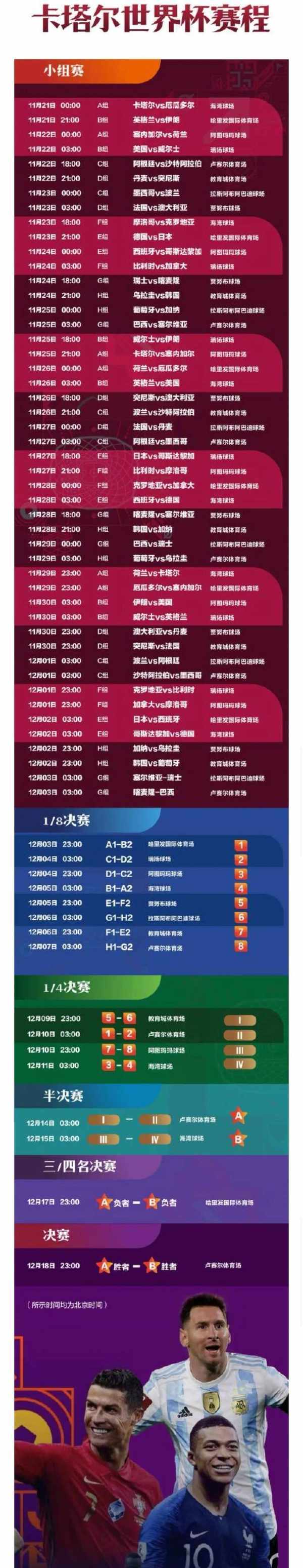 目前,本届世界杯的完整赛程已公布,详细情况如下。大家可以根据自己的时间安排情况及爱好,选择收看不同的赛事!