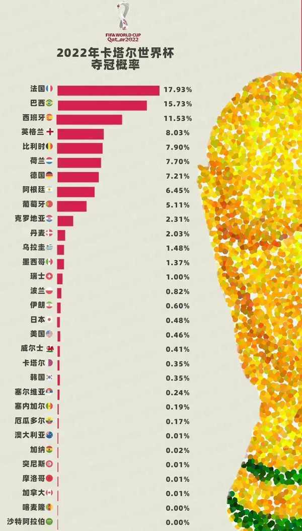 卡塔尔世界杯的夺冠概率已出,国外的夺冠概率以17.93%独占鳌头,其次是桑巴军团的15.73%,第三位是西班牙的11.53%,第四位是英格兰的8.03%,其余的就不一一概述了。