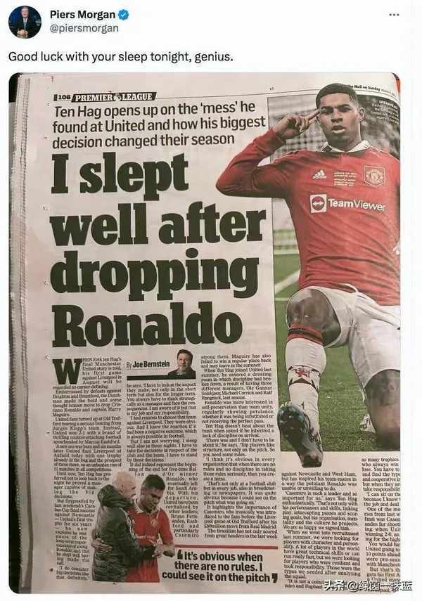 在曼联惨败于英超双红会利物浦后,摩根在社交媒体上晒出一张报纸图片,配上滕哈格接受采访时耳熟能详的话,“离开C罗后,我睡得很好”。曼联双红会惨败后,摩根在社交媒体上开玩笑说:“很好,祝你睡个好觉。”