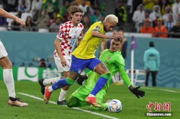 资料图:卡塔尔世界杯1/4决赛,巴西球员内马尔(黄)带球越过克罗地亚门将。中新社