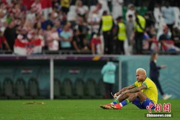 资料图:卡塔尔世界杯1/4决赛,克罗地亚队在点球大战中战胜巴西队,晋级世界杯4强。图为内马尔失落地坐在球场中。中新社