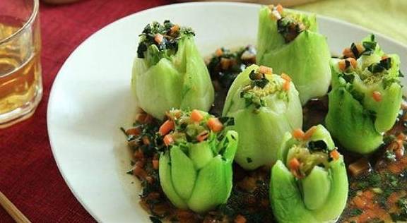 第三步,装盘。先把菜心在盘子上摆好,竖着摆或者是横着摆。然后把准备好的酱汁淋在上面,这样一道美美的翡翠卷心菜就做好了。看上去真的如翡翠一般,颜值超高,都让人舍不得吃呢。