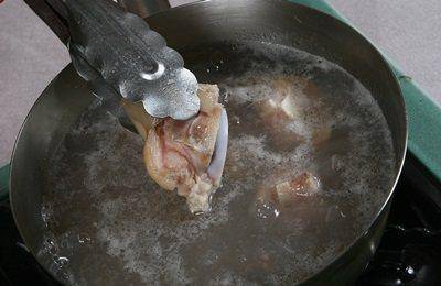 Step3:猪脚汆烫去血水、杂质备用,老姜切厚片备用。