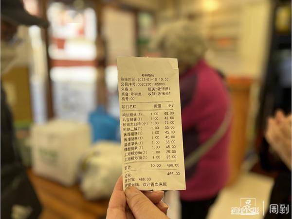 2023年1月,饭店搬迁前,记者在店里遇到市民洪先生和妻子,两位老人是自带了锅子和饭盒到店打包美食的。洪先生告诉记者,这些菜一共花了466元,这里面除了自家点的,还包括了给儿子一家人在内的小菜和砂锅。