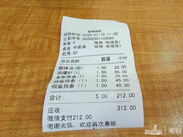 今年77岁高龄的市民陆先生也是店里的老食客,他当天来店也是准备给家人打包带走的。记者看了陆先生的这份菜单,价格一共212元,包括了酸辣汤、油爆虾、本帮熏鱼和两份椒盐排条。陆先生告诉记者,油爆虾是老伴每天早上过过早饭吃的,放在冰箱里冷藏保存可以吃上两三天。