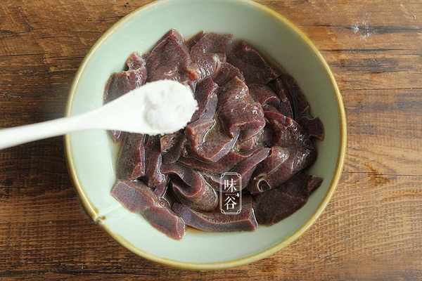 2、猪肝挑去白筋,切薄片,用清水泡出血水后沥干,加点生粉、盐和料酒腌制一会去腥;