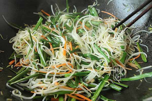 2、热锅冷油,爆香蒜末,倒入豆芽 炒至变软,再放韭菜和胡萝卜丝下锅炒至断生,最后加入盐,鸡精,生抽,香醋调味即可。