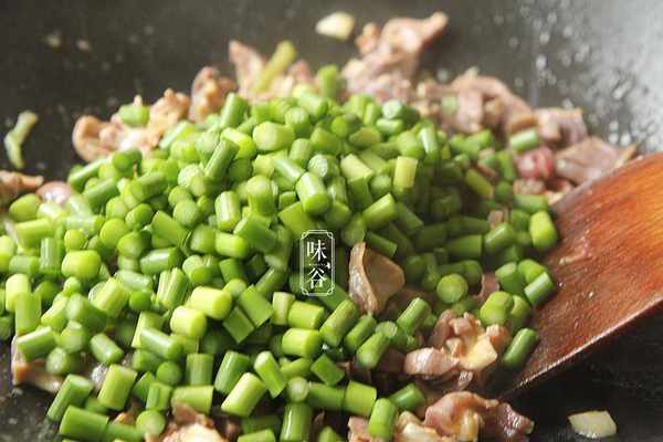 2、热锅下油,炒香蒜和葱白,加入腌制好的鸡胗爆炒,鸡胗差不多熟后加入蒜苔粒继续翻炒;