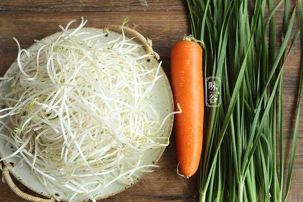 【做法】:1、胡萝卜去皮后切丝,韭菜洗净控干水,切段。绿豆芽洗净控干水待用;