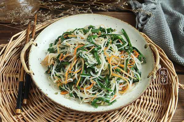 【食材】:韭菜 适量、生抽 1勺、绿豆芽 适量、香醋 1勺、鸡精 少许、胡萝卜 半截、盐 1小勺、蒜末 适量