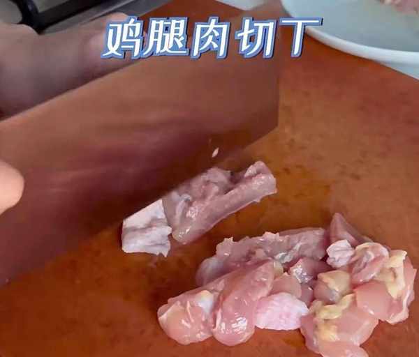 准备两个鸡腿肉,洗净后把它切成丁,切好后就给它腌制一下:酱油一小勺就行了,少许胡椒,胡椒是让它去腥真香的,最后来玉米淀粉一小勺,用手抓匀后放在一边让它腌制,好现在鸡肉就已经准备好了,接下来我们就把姜和蒜处理下就ok 了。